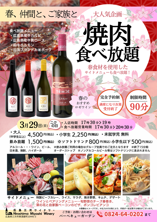 2026年イベントカレンダー 全てのイベント 全体 バーベキュー 2月 3月 4月 1日 2月 3火 4水 5木 6金 7土 8日 9月 10火 11水 12木 13金 14土 15日 16月 17火 18水 19木 20金 21土 22日 23月 24火 25水 26木 27金 28土 29日 30月 31火 やまの中の牡蠣フェア 開催期間:2026年02月28日~2026年03月01日 場所:物産館前 プロムナード 時間:11時~15時 焼きたて、蒸したて・揚げたての牡蠣と自慢の白ワインは相性バツグン! 冬の最強マリアージュをぜひご堪能ください やまの中の牡蠣フェア 開催期間:2026年03月07日~2026年03月08日 場所:物産館前 プロムナード 時間:11時~15時 焼きたて、蒸したて・揚げたての牡蠣と自慢の白ワインは相性バツグン! 冬の最強マリアージュをぜひご堪能ください やまの中の牡蠣フェア 開催期間:2026年03月14日~2026年03月15日 場所:物産館前 プロムナード 時間:11時~15時 焼きたて、蒸したて・揚げたての牡蠣と自慢の白ワインは相性バツグン! 冬の最強マリアージュをぜひご堪能ください やまの中の牡蠣フェア 開催期間:2026年03月21日~2026年03月22日 場所:物産館前 プロムナード 時間:11時~15時 焼きたて、蒸したて・揚げたての牡蠣と自慢の白ワインは相性バツグン! 冬の最強マリアージュをぜひご堪能ください やまの中の牡蠣フェア 開催期間:2026年03月28日~2026年03月29日 場所:物産館前 プロムナード 時間:11時~15時 焼きたて、蒸したて・揚げたての牡蠣と自慢の白ワインは相性バツグン! 冬の最強マリアージュをぜひご堪能ください 焼肉食べ放題 開催日:2026年03月29日 大人気企画!3月29日(ニクの日)に開催 広島県産牛&ブランド豚と春食材を使用した サイドメニューが食べ放題! 大人4,500円(税込) 小学生2,250円(税込) 別途、飲み放題プランもございます。 完全予約制で満席になり次第、受付終了いたします。 予約電話(0824)64-0202まで